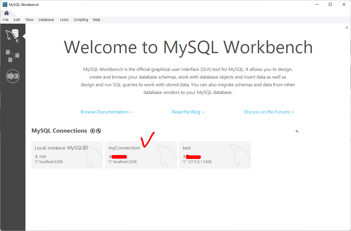 MySQL 워크벤치에 접속하면 이렇게 내가 만들어둔 계정이 나오는데 2번째 myConnection에 연결해볼예정