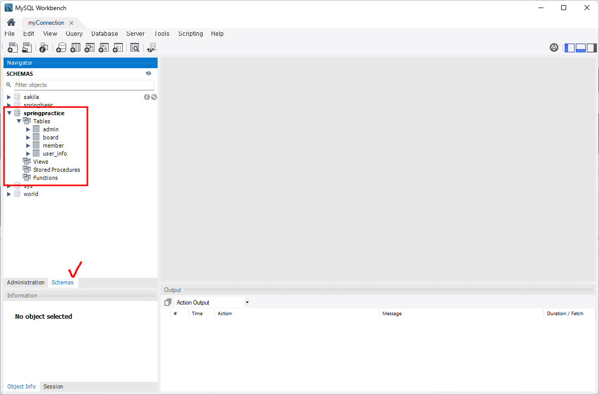 여기서 scheme을 누르면 현재 해당 계정에 존재하는 DB들이 나온다 각각이 하나의 프로젝트라고 생각하면 된다. springpratice에 연결을 할 예정이고 현재는 admin, member, user_info, board 총 4개의 테이블이 있다.